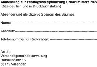 Im März 2024 beabsichtigt die Ortsgemeinde eine Festtagspflanzung durchzuführen. Zur Erinnerung an einen besonderen Anlass können Bürgerinnen und Bürger Bäume spenden, wodurch gleichzeitig ein wichtiger Beitrag für die Umwelt und zur Verschönerung unserer Gemeinde geleistet wird. Die Ortsgemeinde Urbar lädt Sie herzlich ein, im Rahmen einer Festtagspflanzung, einen Baum zu pflanzen. Neben dieser einmaligen Erinnerung an den besonderen persönlichen Anlass und den Pflanztag, erhalten die Spender eine persönliche Urkunde.