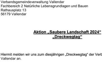 Die „Aktion Saubere Landschaft“ wird in der Verbandsgemeinde Vallendar bereits seit vielen Jahren sehr erfolgreich durchgeführt. Zahlreiche Gruppen haben das Angebot bereits genutzt und an der großen Säuberungsaktion teilgenommen. Das achtlose Wegwerfen oder Liegenlassen von Abfällen hat jeder bereits gesehen. An den Rheinufern, an Autobahnzufahrten und -abfahrten, im Gebüsch oder im Straßengraben, überall sammelt sich das Jahr Müll.