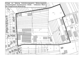 Für diesen Plan, der in dem beigefügten Auszug aus der Flurkarte durch eine fett gedruckte Linie gekennzeichnet ist, wird hiermit eine Veränderungssperre angeordnet.