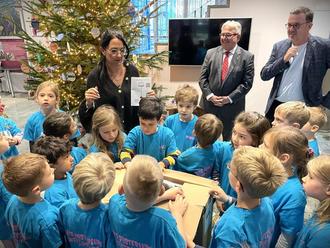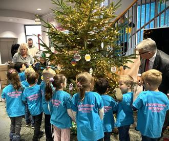 Bereits Tage zuvor haben die Kinder mit Begeisterung gebastelt, geklebt und gefaltet, um schließlich den Weihnachtsbaum im Rathausfoyer zu schmücken.
