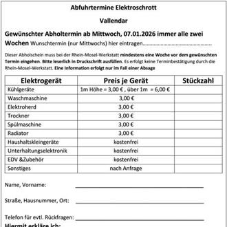 Die Bürgerinnen und Bürger aus der Verbandsgemeinde Vallendar können wieder Elektrogeräte durch die Rhein-Mosel-Werkstatt gGmbH Koblenz in Weißenthurm kostenpflichtig abholen lassen. Die Kosten betragen pro Anfahrt 15,00 € und pro Großgerät 3,00 €. Die Einsammlung von Elektrogeräten erfolgt zu festgelegten Terminen, immer im Laufe des Vormittags. Der Abholtag ist Mittwoch. Bitte senden Sie den Abholschein per Post oder per Mail an die folgende Anschrift: