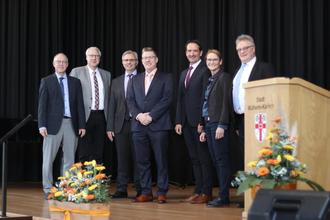 Michael Pahlke (4. von links) ist neuer Schulleiters des Mittelrhein-Gymnasiums in Mülheim-Kärlich mit 800 Schülerinnen und Schülern und 66 Lehrkräften und 10 Vertretungskräften. Es war nur eine kurze Vakanz zu überbrücken, nachdem Klaudia Heck-Ritter als Gründungsschulleiterin im vergangenen Jahr in den Ruhestand eingetreten ist.