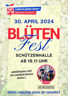 Das Kettiger Blütenfest mit Abkrönung der Holunderkönigin Maria I. findet statt am Dienstag, 30. April 2024 ab 18.11 Uhr in der Schützenhalle. Für Stimmung und gute Laune sorgen The Acoustics, für das leibliche Wohl ist natürlich gesorgt.