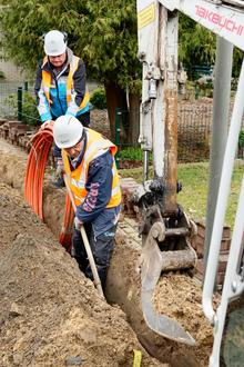 Wahrend der Tiefbauarbelten werden die Leerrohre zum Beispiel mithilfe von Fräsen minimalinvasiv in die Straßen eingebracht und die Glasfaser verlegt. Im Anschluss werden die Gehwege und Straßen vorläufig verschlossen und ordnungsgemäß abgesichert, um die Sicherheit zu gewährleisten. So können im späteren Bauprozess die Gehwege für den Bau der Hausanschlüsse schnell erneut geöffnet werden.