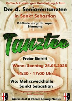 St. Sebastian: „Gutes geht noch besser“; kaum eine Veranstaltung trifft den Wahrheitsgehalt dieser Aussage so sehr wie die Entwicklung unseres Seniorentanztees. Einst geboren aus der Idee an nostalgische Momente anzuknüpfen hat der Tanztee der Seniorenarbeit St. Sebastian ein völlig neues Format entwickelt. Und somit freuen wir uns unseren Seniorinnen und Senioren auch in diesem Jahr wieder einen Tanztee anbieten zu können. Wir begrüßen Sie gerne am Sonntag, 25. Mai 2025, ab 14:30 Uhr in unserer Mehrzweckhalle (Hauptstraße 10-12) zum diesjährigen Tanztee der Senioren/innen. Wie in den Jahren zuvor auch hat DJ Dieda auch in diesem Jahr ein tolles Musikprogramm für uns zusammengestellt. Und wem das Tanzen nicht sonderlich liegt ist gerne willkommen mit uns gesellige Stunden zu verbringen.
