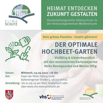 Der Vortrag „Der optimale Hochbeet-Garten“ mit Heike Boomgaarden und Werner Ollig findet statt am Mittwoch, 3. September 2025 um 18 Uhr im Foyer der Peter-Häring-Halle, Kaltenengerser Straße 3 in 56220 Urmitz. Anmeldungen bitte bis 1. September 2025 telefonisch unter 02637 / 913278, per Mail an touristik@vgwthurm.de oder über www.vhs-weissenhturm.de