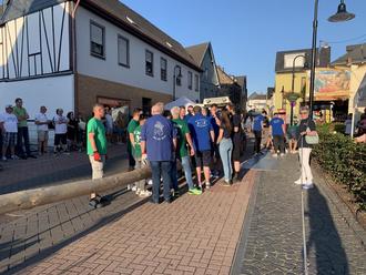 Lagebesprechung: Mitglieder der Ki u. Ka Kärlich und der Ki & Ka Urmitz-Bahnhof halfen dem Fidelio und so stand schon nach 10 Minuten der Mülheimer Kirmesbaum.