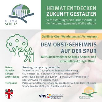 Eine Wanderung, die alle Sinne anspricht, steht auf dem Programm der Klimaschutzreihe „Heimat entdecken - Zukunft gestalten“ der Verbandsgemeinde (VG) Weißenthurm. Am 20. September 2025 sind Naturinteressierte, Familien und alle Freundinnen und Freunde regionaler Genüsse herzlich eingeladen, gemeinsam mit Gärtnermeister Andreas Anheier und Kirschblütenkönigin Kira I. auf Entdeckungstour durch die heimische Obstlandschaft zu gehen.