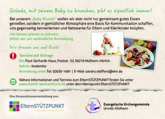 Verbindliche Anmeldungen zu dem kostenlosen Baby-Brunch sind telefonisch möglich unter 02630 / 1481 oder per Mail an sandra.steffens@ekir.de