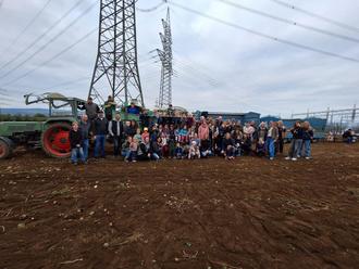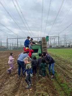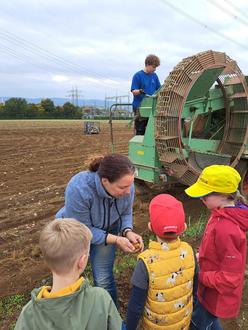 Dort wartete die Kartoffelmaschine auf uns. Mit großen Augen verfolgten die Kinder, wie die Knollen aus der Erde geholt wurden - und halfen natürlich eifrig mit.