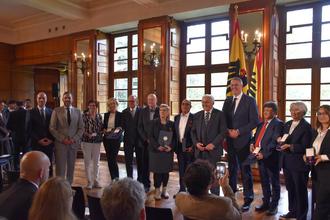 Die neuen Träger des Bundesverdienstkreuzes mit den ersten Gratulanten: Clemens Hoch, Minister für Wissenschaft und Gesundheit (1.v.l.), Andernachs Oberbürgermeister Christian Greiner (2.v.l.) und Ministerpräsident Alexander Schweitzer (10.v.l.)