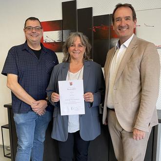 VG-Bürgermeister Thomas Przybylla gratulierte herzlich zum besonderen Dienstjubiläum. „Claudia Piske prägt mit ihrem Engagement, ihrer Erfahrung und ihrer unerschütterlichen Freude am Beruf seit 40 Jahren das Leben unzähliger Kinder und Familien und unterstützt ihr Team“, betonte Przybylla und dankte für den Einsatz auch im Personalrat. Die Zusammenarbeit bezeichnete er als durchaus kritisch, aber immer konstruktiv. Für den Leiter des Fachbereichs Jugend, Familie, Bildung, Sven Normann, ist Piske eine unverzichtbare Kollegin und ein echtes Vorbild: „Ihre Leidenschaft für die Arbeit mit Kindern und ihre fachliche Kompetenz bereichern unsere Kitas.“ Der Vorsitzende des Personalrats, Marko Röser, überbrachte die Glückwünsche der gesamten Belegschaft und überreichte gemeinsam mit Bürgermeister Przybylla einen Geschenkkorb mit allerlei Köstlichkeiten, die zum gemeinsamen Verzehr mit der Familie zuhause gedacht sind. Außerdem gab es ein Schreibset und eine Urkunde.