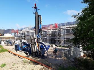 Großes Bohrgerät arbeitet sich auf dem Außengelände der neuen Kindertagesstätte Wiebelsheim stetig in die Tiefe. Mit sechs Bohrungen in jeweils 125 m Tiefe soll die notwendige Erdwärme gewonnen werden, um mit Unterstützung einer Erdwärmepumpe und einer Photovoltaikanlage mehr als 90 Prozent der Wärmeenergie für die Kindertagesstätte aus erneuerbaren Energien zu erhalten. Eine Investition mit hohen Kosten, die sich aber in den nächsten Jahren durch ersparte Betriebskosten amortisieren wird.