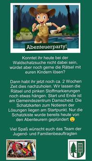 Im Rahmen der Einweihung des Traumschleifchens Kuckucksnack wurde für die Kinder und Jugendlichen in Damscheid eine Waldschatzsuche organisiert und durchgeführt. Der Arbeitskreis Jugend- und Familienbeauftragte hatte sich im Vorfeld viel Arbeit mit der Ausarbeitung gemacht. Hierfür seitens der Ortsgemeinde ein herzliches Dankeschön. Und die Kinder fanden es toll. Unabhängig vom Traumschleifchen führten auf geeigneten Wald- und Feldwegen Hinweise und Rätsel zum gesuchten Schatz. Am Ende der Schatzsuche durften sich die eifrigen Sucher mit Getränken und Speisen am Gemeindezentrum stärken. Eine herrliche Aktion.