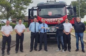 Stellvertretender Wehrleiter Torsten Weißhaupt, Wehrleiter Andre Stein, stellvertretender Wehrführer Patric Niedenhoff, Wehrführer Simon Mallmann, Bürgermeister Peter Unkel, stellvertretender Wehrleiter Volker Stiehl und Maximilian Reich von der Firma CER (Partner Magirus), v. l. n. r.