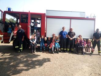 Am 4. Juli 2023 besuchte uns die freiwillige Feuerwehr mit Blaulicht und Sirene im Waldkindergarten. Die Wurzelzwerge hatten zuvor einige Fragen gesammelt, z. B. „Was passiert, wenn der Knopf an der Drehleiter kaputt ist und Menschen oben im Korb sind?“; „Kommt das Löschwasser aus dem Brunnen?“; „Wie wurde ganz früher das Feuer gelöscht?“. Auf jede Frage gab es kindgerechte Antworten. Besonders spannend fanden die Kinder die Ausrüstung mit der Gasmaske und der Sauerstoffflasche. Als alle Fragen beantwortet waren, durften die Wurzelzwerge mit den Löschschläuchen Feuerwehr spielen. Da wurde nicht nur die Wiese patschenass, sondern auch viele fröhliche Wurzelzwerge. Zum Abschluss gab es eine Fahrt im Feuerwehrauto mit Blaulicht und Sirene. Da leuchteten viele Kinderaugen.