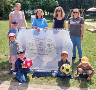 Eines der Tore ist das Abschiedsgeschenk der "schlauen Dinos", die nach den Ferien in die Schule gehen. Und da man Fußball noch viel besser mit zwei Toren spielen kann, hat der Förderverein ein zweites Tor zugesteuert - auf dass viele Bälle in den neuen Netzen landen.