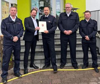 v.l.n.r. Stv. Wehrleiter Torsten Weißhaupt, Bürgermeister Peter Unkel, Sascha Engel, Wehrführer Joachim Elbrecht und der Stv. Wehrführer Mike Scholle.