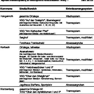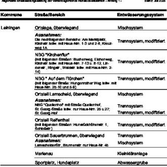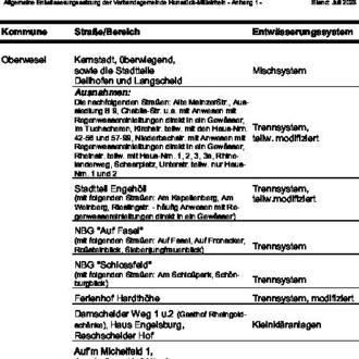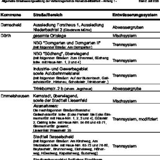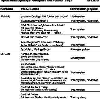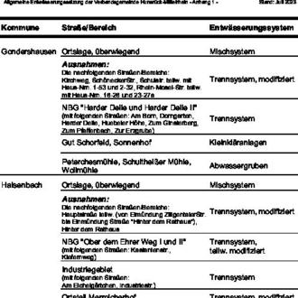 Der Anhang 1 der Allgem. Entwässerungssatzung enthält eine Übersicht über die Art der Entwässerung aller Städte/Ortsgemeinden im Bereich der Verbandsgemeinde Hunsrück-Mittelrhein.