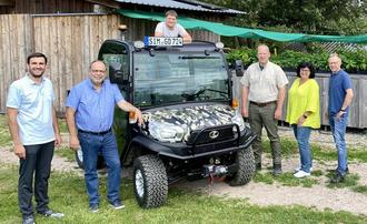Freudige Gesichter bei der Fahrzeugübernahme. Stadtbürgermeister Marius Stiehl, Ortsbürgermeister Peter Kuhn, Revierförster Timo Hans, Beigeordnete Sabine Seckler und Achim Vogel, sowie Carsten Stahl (auf dem Fahrzeug) machten sich einen Eindruck vom neuen Fahrzeug.