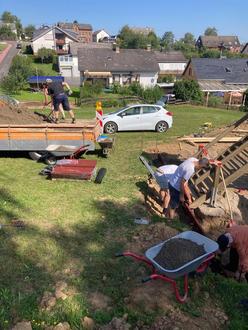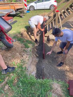 Nach den erforderlichen Baggerarbeiten zum Aushub der Einfassung wurde Lava eingebracht. Der städt. Bauhof lieferte den Beton, so dass durch die fleißigen Helfer die Gummieinfassung eingesetzt werden konnte.