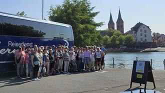 Um 9:30 Uhr waren die 43 Teilnehmer/innen bei schönstem Wetter zur Abfahrt bereit. Der Proviant wurde in den modernen Reisebus gepackt. Dieses Jahr fuhr uns Sarah Hermani mit Reisebegleitung Mutter Marion souverän und sicher. Kurz vor Seligenstadt machten wir Rast mit dem mitgebrachten 2. Frühstück und jeder konnte sich stärken. Nun ging es über die bayrische Landesgrenze nach Karlstein am Main. Dort parkten wir den Bus direkt an der Fähre. Mit wenigen Meter Fußweg zur Fähre, gelangten wir zum Zielort Seligenstadt, dass in Hessen liegt. Der Main ist also die Landesgrenze. Nach dem Übersetzen waren wir direkt in der Altstadt von Seligenstadt. Von dort aus wurden wir von 2 gebuchten Stadtführern ca. 90 min durch die historische Stadt geführt. Vorbei an der Basilika aus dem 9. Jahrhundert, durch den sehr schön angelegten Klostergarten, den Freihof, an schönen Fachwerk-Fassaden vorbei bis zum Marktplatz.