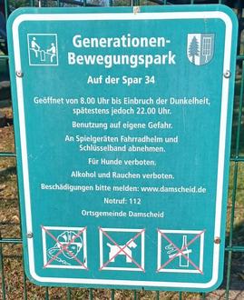 Aus gegebener Veranlassung wird auf die Einhaltung der Vorgaben am Kinderspielplatz hingewiesen. Diese sind auf dem Hinweisschild am Eingang des Platzes klar und eindeutig beschrieben (siehe Foto). Zukünftige Kontrollen werden nicht ausgeschlossen.