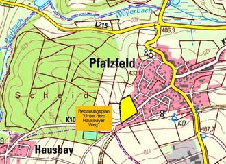 Der Ortsgemeinderat der Ortsgemeinde Pfalzfeld beschließt, das Verfahren zu Aufstellung des Bebauungsplanes „Unter dem Hausbayer Weg“ im Regelverfahren nach § 2 BauGB weiter fortzuführen.