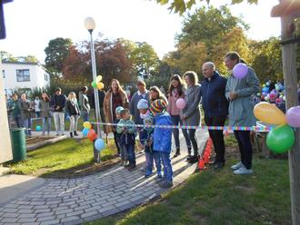 Im Beisein der Kinder und Erzieherinnen sowie zahlreicher Eltern haben Kita-Leiterin Marion Bode und VertreterInnen des Elternausschusses den Weg gemeinsam mit Bürgermeisterin Andrea Mallmann und Pastor Christian Adams, der die neue Strecke und alle Benutzer zuvor segnete, mit einem symbolischen Bandschnitt freigegeben.