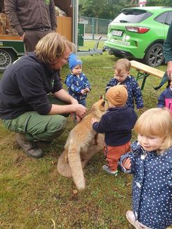 Unser Revierförster Herr van den Berg und sein Kollege hatten viele interessante Dinge im Gepäck, die die Mädchen und Jungen zum Staunen brachten. Besonders aufregend war es, die ausgestopften Tiere aus nächster Nähe zu betrachten. Die Kinder durften die Tiere nicht nur anschauen, sondern auch vorsichtig berühren. So konnten selbst die Kleinsten ertasten, wie sich zum Beispiel das Fell eines Fuchses oder das Gefieder eines Vogels anfühlt.