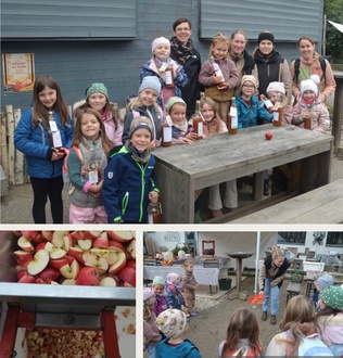 An 4 Stationen haben wir erfahren, wie aus Äpfeln Saft gepresst wird. Jedes Kind hatte die Möglichkeit, sich aktiv einzubringen und zum Schluss seine eigene Flasche Apfelsaft zu zapfen, mit individuellem Etikett zu gestalten und stolz mit nach Hause zu nehmen. Auch einige Tiere des Parks gehen dabei nicht leer aus und kommen auf den Geschmack der ausgepressten Apfelreste.