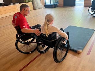 Als besonderes Highlight durften die Schülerinnen und Schüler anschließend in der Turnhalle selbst in mitgebrachten Rollstühlen verschiedene Aufgaben ausprobieren, wie Slalomfahren, das Überwinden von Hindernissen und das Spielen mit Bällen. Mit großer Begeisterung und vollem Körpereinsatz nahmen sie an diesen Aktivitäten teil.