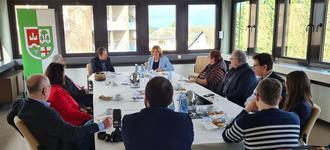 In angeregter Runde diskutierten mit Ministerpräsidentin Malu Dreyer und Bürgermeister Peter Unkel, die Beigeordneten der Verbandsgemeinde Hunsrück-Mittelrhein, Christian Stahl, Britta Möller-Labohm und Karl-Heinz Hoffmann, die Stadtbürgermeisterin von Emmelshausen, Andrea Mallmann, der Leiter des Fachbereichs Bauen, Stefan Assies, Klimaschutzmanager Thilo Kirstfeld und Sarah Weyrich von der Bauverwaltung.