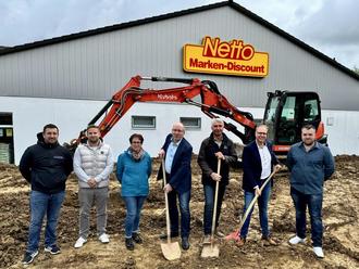Die kommunalen Vertreter, der Markt- und Gebietsleiter Expansion der Firma Netto-Marken-Discount sowie Vertreter der bauausführenden Firma beim Spatenstich