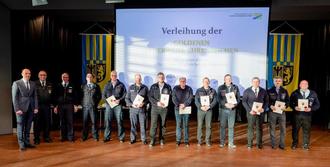 Am 14.04.2023 überreichten Landrat Volker Boch und der Brand- und Katastrophenschutzinspekteur (BKI) Stefan Bohnenberger im Auftrag von Michael Ebling, Minister des Innern und für Sport, in der Hunsrückhalle in Simmern das Goldene Feuerwehr-Ehrenzeichen des Landes Rheinland-Pfalz. Mit dieser Auszeichnung werden die ehrenamtlichen Feuerwehrangehörigen für Ihre langjährige aktive und treue Pflichterfüllung im Feuerwehrdienst geehrt.