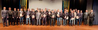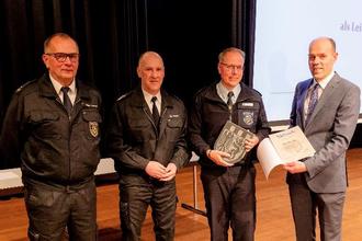 Im Rahmen der Veranstaltung in Simmern wurde auch Peter Müller als Leiter der Feuerwehr-Kreisausbilder verabschiedet. Landrat Volker Boch, BKI Stefan Bohnenberger und der stellv. BKI Christian Albrecht dankten Peter Müller für seine 17-Jährige Tätigkeit und sein Engagement in seiner Funktion als Leiter der Kreisausbildung. Als Anerkennung erhielt er von Landrat Volker Boch mit dem Wappenschild die Ehrengabe des Rhein-Hunsrück-Kreises.