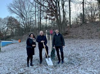 v.l.n.r.: Agnes Chudy-Endres, Ortsbürgermeisterin Gemünden, Harald Rosenbaum, Bürgermeister der Verbandsgemeinde Kirchberg, und Florian Schmidt, Regionalmanager bei Westenergie, beim symbolischen Spatenstich zur Baumpflanzaktion am Freibad in Gemünden