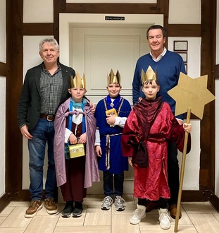 Der 1. Beigeordnete Wolfgang Wagner und Stadtbürgermeister Werner Wöllstein freuten sich über den alljährlichen Besuch und bedankten sich bei den Sternsingern für ihre Bereitschaft, den Segen zu überbringen und Spenden für Kinder weltweit zu sammeln, denen es nicht so gut geht.