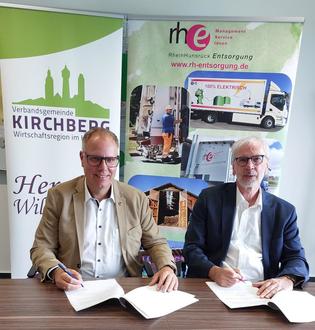 An diesem Tag unterzeichneten der Bürgermeister der Verbandsgemeinde Kirchberg, Herr Peter Müller, und der Vorstand der RHE, Herr Thomas Lorenz, den Vertrag zur offiziellen Anbindung des Verwaltungsgebäudes der Verbandsgemeinde Kirchberg an die Heizzentrale Kirchberg.