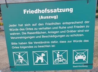 Die Friedhofssatzung der Stadt Kirchberg legt in § 5, Absatz 3 Ziffer h fest, dass es nicht gestattet ist, Tiere, ausgenommen Blindenhunde, auf den Friedhof mitzubringen.