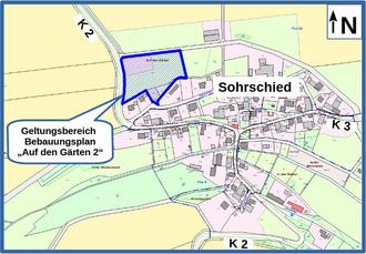 Der Ortsgemeinderat der Ortsgemeinde Sohrschied hat in der Sitzung am 24.04.2024 den vom Planungsbüro erarbeiteten Entwurf des Bebauungsplanes „Auf den Gärten 2“ mit dem unter 1) genannten Geltungsbereich als Grundlage für das Aufstellungsverfahren angenommen. Mit diesen Planunterlagen soll das gesetzlich erforderliche Beteiligungsverfahren durchgeführt werden.