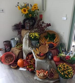 Zuerst fand eine Erntedankandacht statt und das Team hatte einen schönen Erntedanktisch vorbereitet. Dann wurde das Mittagessen serviert. Es gab Römerbraten mit selbstgemachtem Kartoffelsalat, Krautsalat und Meerrettich und leckeres Brot, dazu diverse Getränke. Anschließend konnten sich die Leute unterhalten, währenddessen die Küche aufgeräumt und weiteres vorbereitet wurde. Da ja alle gut gegessen hatten und auch ein wenig geruht, brach Angelika nun zu einem meditativen Herbstspaziergang auf, das heißt, sie las eine Geschichte vor und die Leute konnten in Gedanken mitgehen.