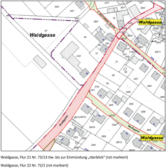 1. Waldgasse, Flur 22 Nr. 72/1, Flur 21 Nr. 73/13 tlw. bis zur Einmündung „Idarblick“ (Fl. 21 Nr. 24/17)