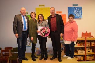 Bürgermeister und Vorsitzender des Kita-Zweckverbandes Peter Müller, Ortsbürgermeister und stellvertretender Zweckverbandsvorsteher Markus Bongard sowie die stellvertretende Leiterin der Kita Zauberland Anna Görzen und die Personalratsvorsitzende Simone Schreiner gratulierten Frau Ghanbar herzlich und wünschten ihr für die Zukunft alles Gute.
