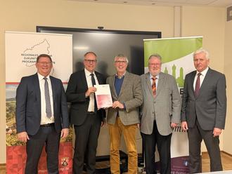 Von den insgesamt rund 3,3 Millionen Euro, die die Verbandsgemeinde Kirchberg daraus erhält, kann fast eine Million passgenau in Klimaschutz- und Klimaanpassungsmaßnahmen investiert werden“, sagte Klimaschutzstaatssekretär Dr. Erwin Manz heute in Kirchberg, wo er Peter Müller, Bürgermeister der Verbandsgemeinde Kirchberg, den Förderbescheid über die Gesamtsumme von rund 3,3 Millionen Euro überreichte.