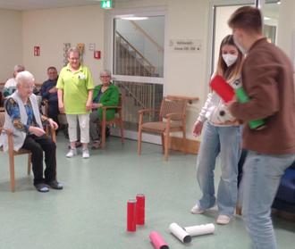Abschluss dieser Unterrichtseinheit bildete ein Projettag im Seniorenheim St. Hildegard in Simmern, das die HuS-Gruppe einen Vormittag lang besuchte. Neben vielen Informationen und Eindrücken war für die Schülergruppe besonders die Umsetzung eigener Angebote mit den Bewohnern des Seniorenheims interessant. Im Vorfeld haben sie diese mit vielen Ideen vorbereitet, wie z. B. Sitz-Kegeln, Montagsmaler, Bingo und Osterbasteln. Vor Ort hatten sie dann die Gelegenheit, diese Angebote mit Seniorengruppen selbstständig durchzuführen, was von den Bewohnern sehr positiv angenommen wurde und auch den Schülerinnen und Schülern viel Freude bereitete. An der Stelle noch einen herzlichen Dank an die Mitarbeiter des Seniorenheims St. Hildegard, insbesondere an Frau Helsper, die der HuS-Gruppe einen sehr guten Einblick in das Seniorenheim, das Thema Pflege und auch die Möglichkeiten der vielfältigen Berufsbilder gegeben hat.