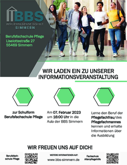 Die Berufsfachschule Pflege der BBS Simmern bietet am 07.02.2023 um 16.00 Uhr in der Aula der BBS (Gebäude E; Raum 201) eine Informationsveranstaltung zum Ausbildungsberuf als „staatlich geprüfte/r Pflegefachfrau/Pflegefachmann“ an. Der nächste Ausbildungsgang startet am 01.08.2023. Alle Interessierten sind herzlich eingeladen.