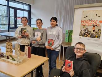 Im folgenden Vorlesewettbewerb stellten dann die Klassensieger der Klassen 6a (Miro Pfeiffer, Eda Sengül) und 6b (Marie Kley, Sophia Schneider) ihr Können unter Beweis. Bewertet wurden dabei Lesetechnik, Interpretation und Auswahl der Textstelle sowie das Vorlesen eines unbekannten Textes in einer zweiten Runde.