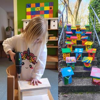 In den vergangenen Wochen haben die Wackelzähne den Umgang mit Werkzeug geübt. Unter Anleitung haben sie mit dem Akkuschrauber hantiert und fleißig Nistkästen zusammengebaut. Die angehenden ABC Schützen beschäftigten sich zusätzlich intensiv mit dem Lebensraum der Vögel. Bei der Gestaltung der Nistkästen war Fantasie und Kreativität gefragt. Es entstanden viele individuelle Kunstwerke.
