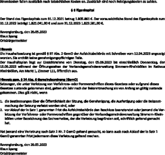 | 2. | vor Ablauf der in Satz 1 genannten Frist die Aufsichtsbehörde den Beschluss beanstandet oder jemand die Verletzung der Verfahrens- oder Formvorschriften gegenüber der Verbandsgemeindeverwaltung Simmern-Rheinböllen unter Bezeichnung des Sachverhaltes, der die Verletzung begründen soll, schriftlich geltend gemacht hat. |